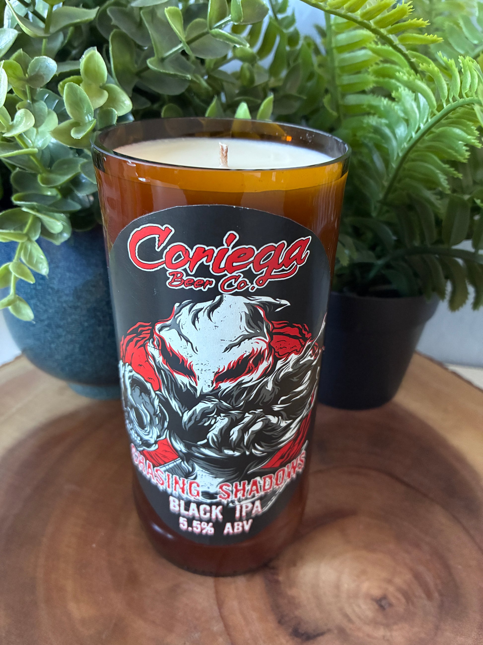 Chasing Shadows beer by Coriega Beer Co candle created from discarded (16oz size) bottle. 100% soy wax, 1 wick.