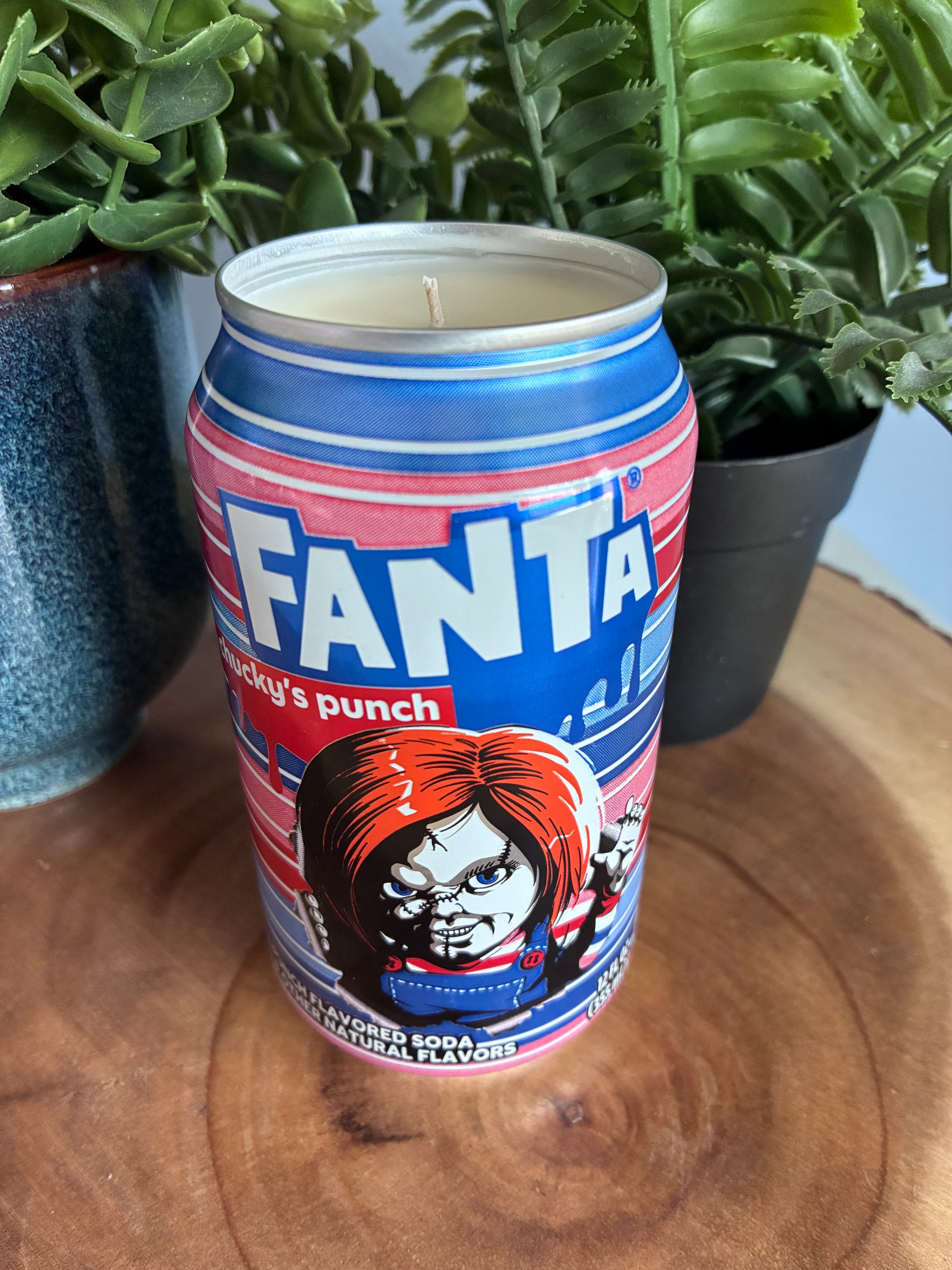 Fanta Fruit Punch 'Chucky' soda candle created from discarded (12oz size) can. 100% soy wax, 1 wick.
