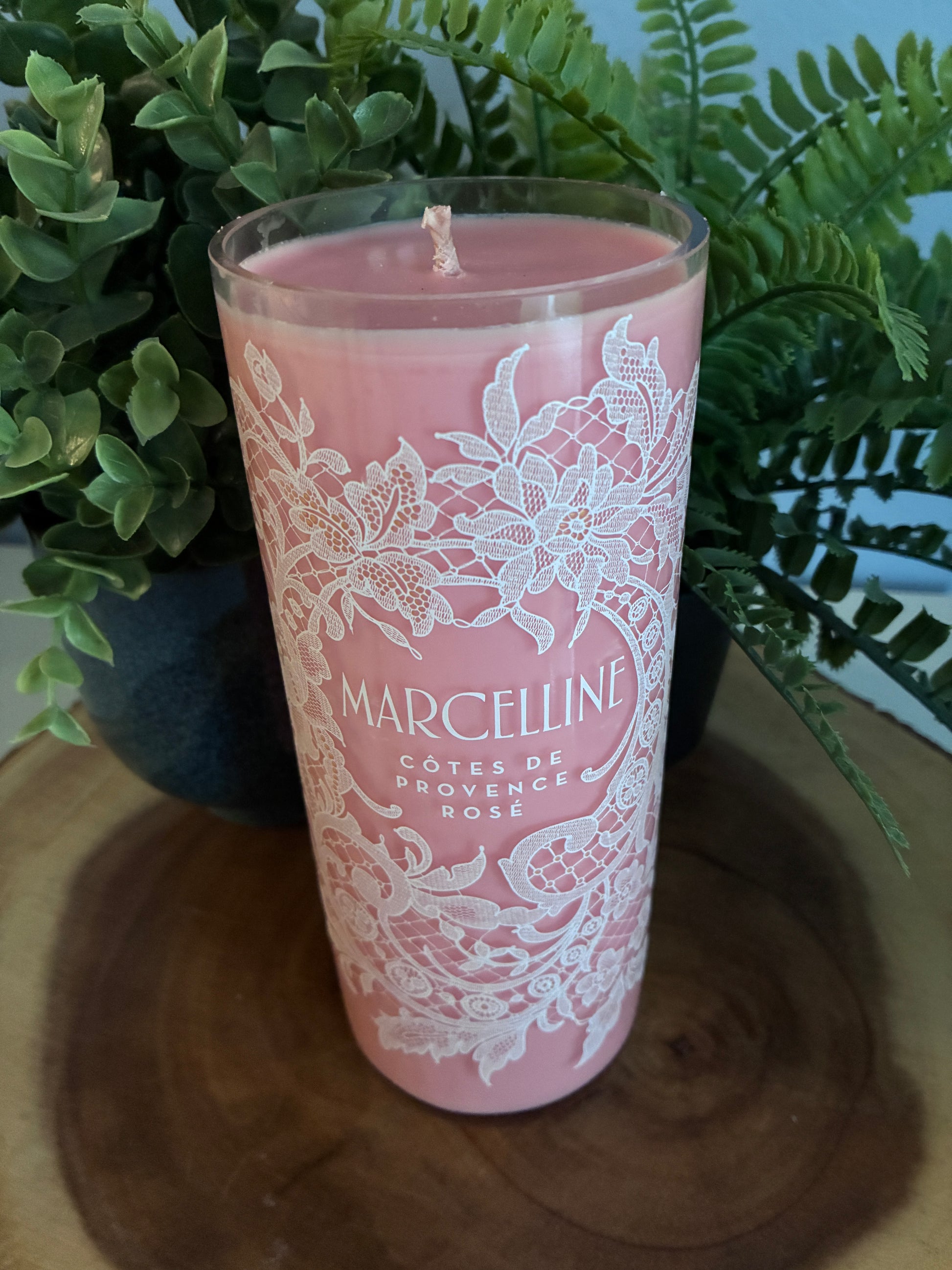 Marcelline Rose wine candle created from discarded (750ml size) bottle. 100% soy wax, 1 wick.