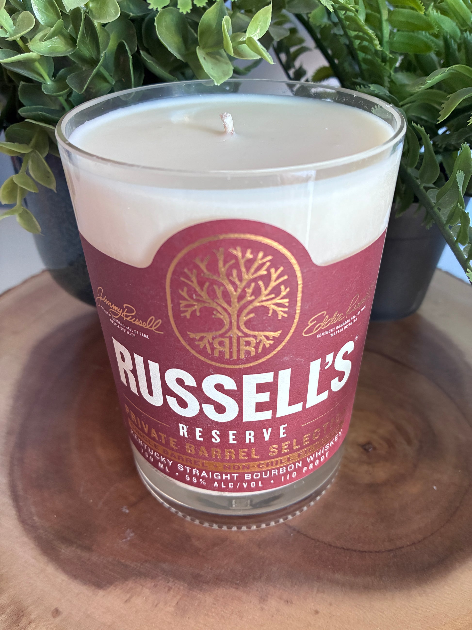 Russell's Reserve 'Private Barrel Selection' Kentucky Straight Bourbon Whiskey candle created from discarded (750ml size) bottle. 100% soy wax, 1 wick.