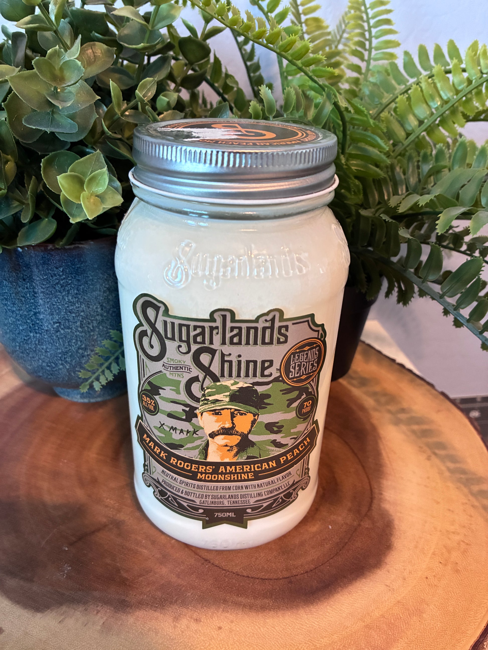 Sugarlands Shine American Peach Moonshine candle created from discarded (750ml size) bottle. 100% soy wax, 1 wick.