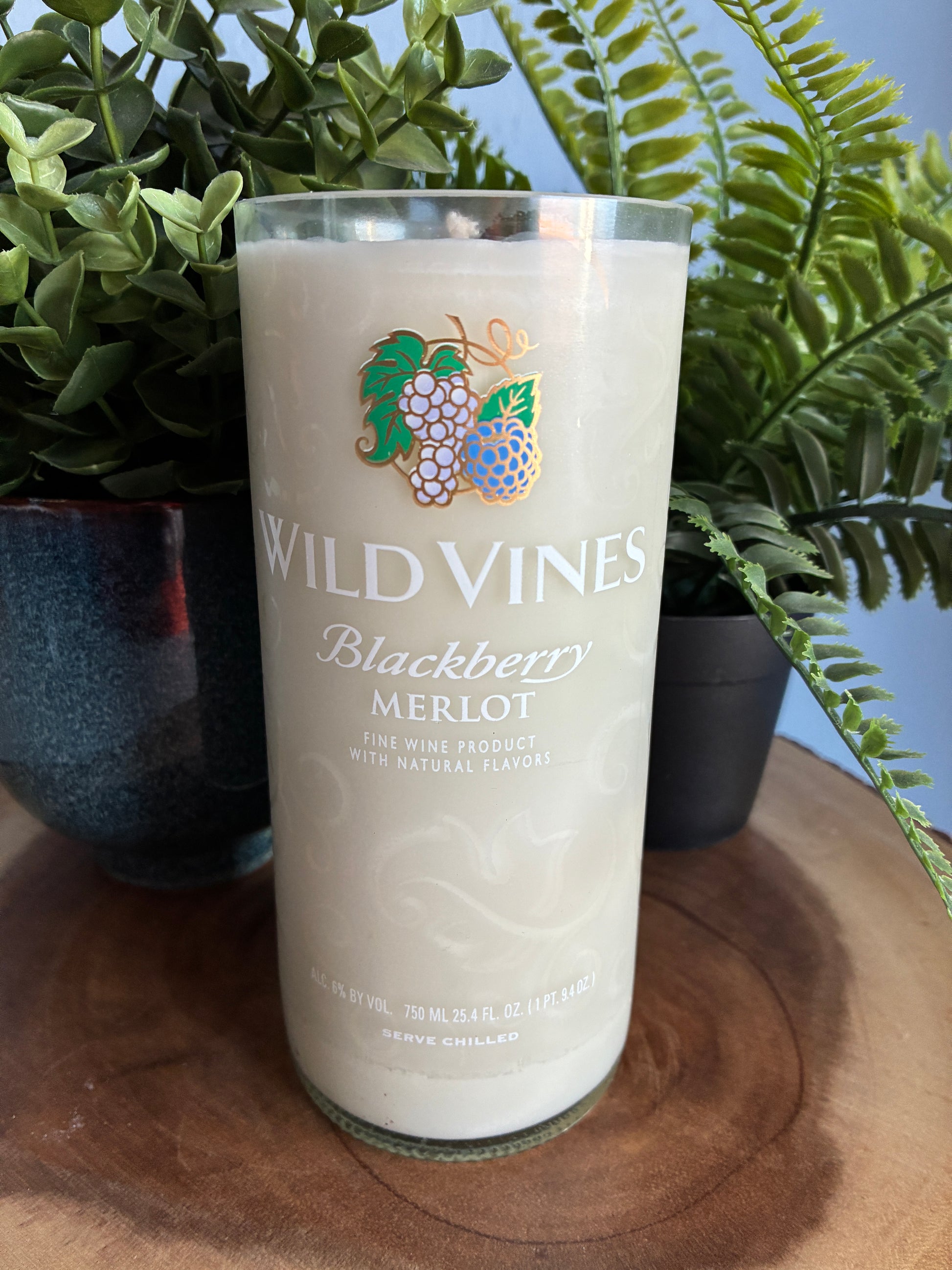 Wild Vines Blackberry Merlot Wine candle created from discarded (750ml size) bottle. 100% soy wax, 1 wick.